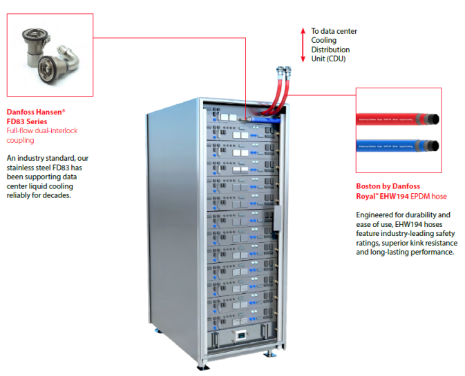 丹佛斯的直接芯片冷却解决方案通过高效布线、灵活、无扭结的软管以及无泄漏、经过氦气测试的接头延伸到机架中。